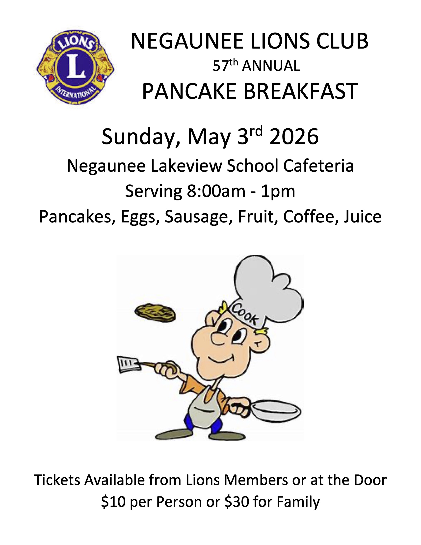 May 3, 2026 – Negaunee Lions Club Pancake Breakfast